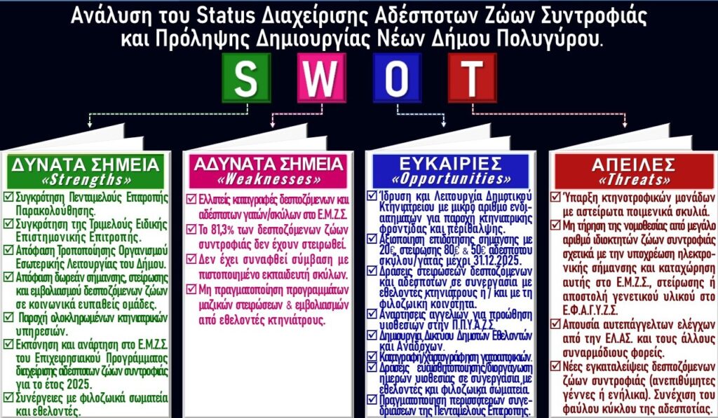 Η άμεση κινητοποίηση των απαραίτητων δομών και η ενεργή συμμετοχή του Αστυνομικού Τμήματος κρίνονται απαραίτητες. Η διεξαγωγή τακτικών, στοχευμένων και αυτεπαγγέλτων ελέγχων για την ηλεκτρονική σήμανση και την καταχώριση στο ΕΜΖ.Σ. είναι αναγκαιότητα. Δυστυχώς, οι έλεγχοι που πραγματοποιήθηκαν τα έτη 2023 και 2024 ήταν πενιχροί. Ο Δήμος Πολύγυρου έχει αποδείξει ότι διαθέτει τη βούληση και τις δυνατότητες να αντιμετωπίσει αυτή την πολύπλευρη πρόκληση. Η συνέχιση και η ενίσχυση των προσπαθειών σε όλους τους τομείς – από την πρόληψη και τη στείρωση έως τους ελέγχους και τις υιοθεσίες – είναι το κλειδί για μακροπρόθεσμες λύσεις και την ευημερία των ζώων στην περιοχή.