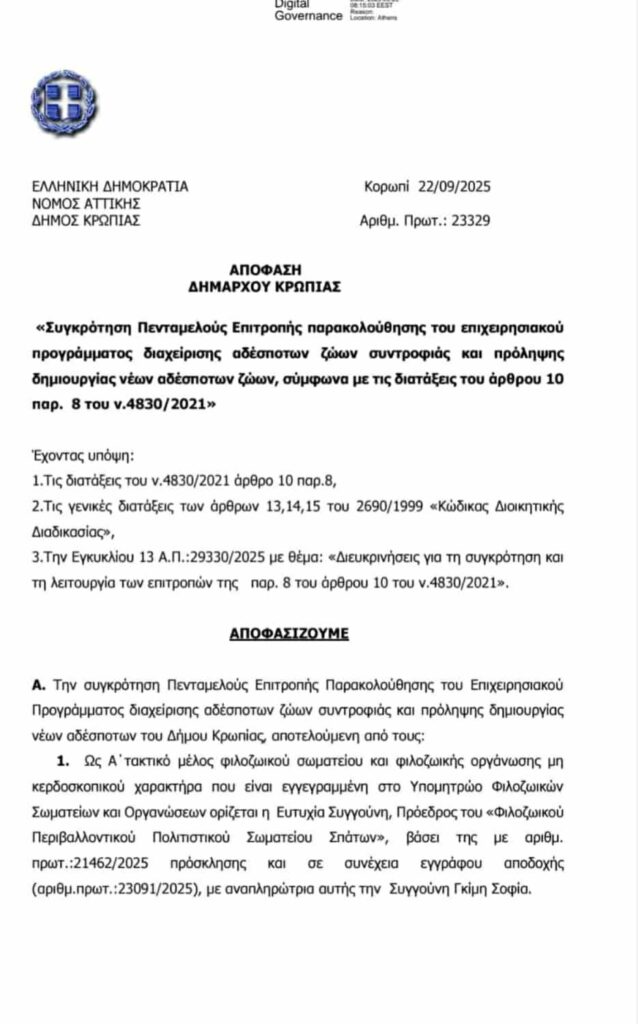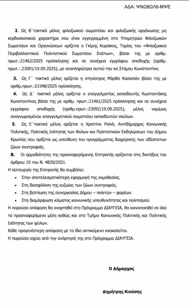 Κίνηση πανικού ενόψει αυτών που έρχονται ως κεραυνός στο κεφάλι του Δημάρχου Κορωπίου Δημήτρη Κιούση για όσα δεν έχει πράξει ενώ όφειλε υπερ των αδέσποτων ζώων της περιοχής του. Όταν λοιπόν ο κος Κιούσης έμαθε για την επιστολή της «Φιλοζωικής δράσης εθελοντών Αγ Μαρίνας Κορωπίου» που τον κατήγγειλε για τις παραλείψεις του, έπραξε το απίστευτο! Στις 22-09-2025 με απόφαση του όρισε Πενταμελή Επιτροπή από ανθρώπους του Δήμου Σπάτων-Αρτέμιδος και όχι από τα μέλη της «Φιλοζωικής δράσης εθελοντών Αγ Μαρίνας Κορωπίου» που αποτελείται από δημότες του Δήμου του! Προφανώς βρήκε «προθύμους» να συνδράμουν τις παραλείψεις του και απέκλεισε αυτούς που μάχονται στο Κορωπί για τα αδέσποτα. Είναι βέβαια αυτοί οι αποκλεισμένοι που τον έχουν καταγγείλει προσφάτως…