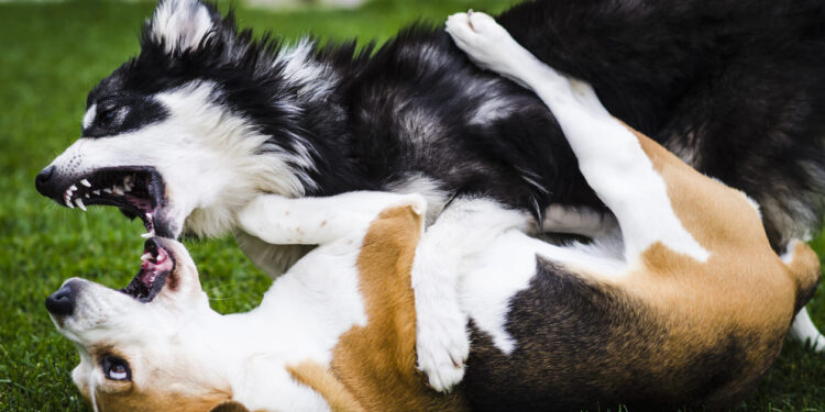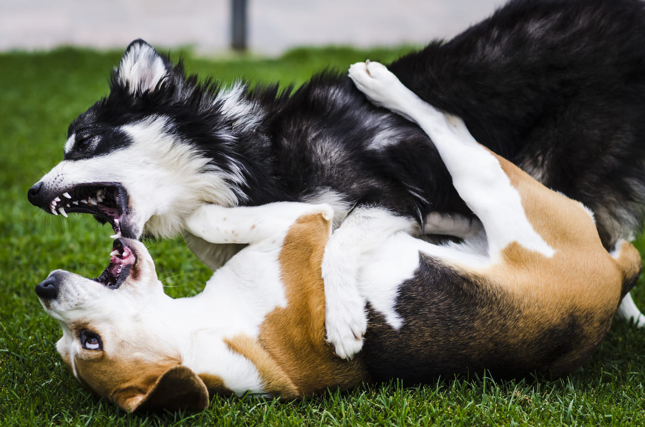 Εάν δεν μπορέσετε να αποτρέψετε έναν καβγά πρέπει να πάρετε άμεσα και με ασφάλεια μέτρα για να τον σταματήσετε. Μην επιχειρήσετε να απλώσετε τα χέρια σας και να τραβήξετε τα ζώα μακριά, γιατί μπορεί να σας δαγκώσουν. Προσπαθήστε να αποσπάσετε την προσοχή τους με έναν δυνατό θόρυβο, όπως το χτύπημα ενός πράγματος. Μπορείτε επίσης να ρίξετε ένα μπουφάν ή μια πετσέτα στο κεφάλι κάθε σκύλου για να μην βλέπουν ο ένας τον άλλον. Αν η «μάχη» συνεχίζεται προσπαθήστε να τοποθετήσετε ένα αντικείμενο ανάμεσα τους.