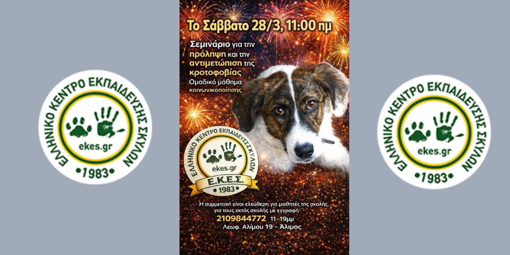 Το Σάββατο 28 Μαρτίου, στις 11:00 π.μ., οι ιδιοκτήτες σκύλων έχουν την ευκαιρία να αποκτήσουν πολύτιμες γνώσεις και πρακτικά εργαλεία. Ειδικότερα, στο Ε.Κ.Ε.Σ. (Λ. Αλίμου 19, Άλιμος), θα πραγματοποιηθεί μια εκδήλωση αφιερωμένη στην ψυχική υγεία και ευζωία των σκύλων. Το σεμινάριο επικεντρώνεται στην κροτοφοβία σκύλων, προσφέροντας λύσεις για την ανακούφιση των ζώων μας από τον πανικό που προκαλούν οι δυνατοί θόρυβοι, όπως τα βεγγαλικά και τα πυροτεχνήματα.