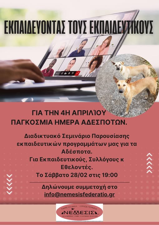 Με τίτλο «Εκπαιδεύοντας…..τους Εκπαιδευτικούς», το σεμινάριο της ΝΕΜΕΣΙΣ αποτελεί μια σημαντική κίνηση προς την ενίσχυση της φιλοζωικής κουλτούρας και της περιβαλλοντικής ευαισθητοποίησης. Η πρωτοβουλία αυτή πραγματοποιείται ενόψει της 4ης Απριλίου, της Παγκόσμιας Ημέρας Αδέσποτων Ζώων – μιας ημέρας που η Ομοσπονδία επιθυμεί να καθιερωθεί και να γιορτάζεται στα σχολεία.