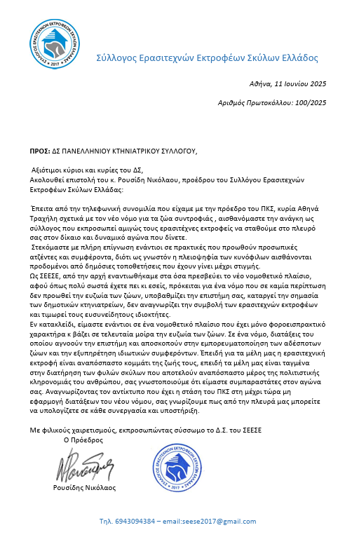 Σύμφωνα με το ΣΕΕΣΕ: «από την αρχή εναντιωθήκαμε στα όσα πρεσβεύει το νέο νομοθετικό πλαίσιο. Ο λόγος είναι όποως αναγράφεται σχετικά ότι «πρόκειται για ένα νόμο που σε καμία περίπτωση δεν προωθεί την ευζωία των ζώων». Εκ παραλλήλου επισημαίνεται ότι επιπροσθέτως: