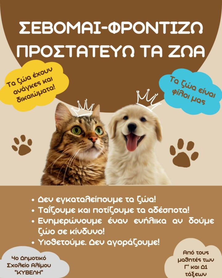 Μια πράξη αγάπης και αλτρουισμού, πράγματι αξιέπαινη, ήρθε να υπενθυμίσει τη σημασία της φιλοζωίας. Συγκεκριμένα, οι μαθήτριες και οι μαθητές της Γ’ Τάξης του 4ου Δημοτικού Σχολείου Αλίμου «Κυβέλη» απέδειξαν έμπρακτα πως η αγάπη για τα ζώα αποτελεί θεμελιώδη αξία παιδείας και πολιτισμού. Η πρωτοβουλία τους, στο πλαίσιο του προγράμματος φιλοζωίας της φετινής σχολικής χρονιάς, αναδεικνύει την ευαισθησία της νέας γενιάς.