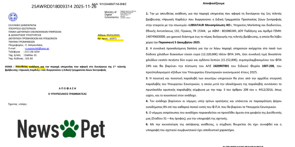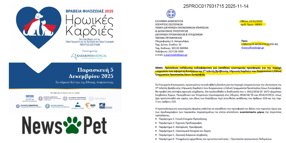 -Στις 13-11-2025 ο Υπηρεσιακός Γραμματέας του Υπουργείου Εσωτερικών Παντελής Ταγκαλάκης, υπογράφει την πρόσκληση εκδήλωσης ενδιαφέροντος για κατάθεση οικονομικής προσφοράς για την παροχή υπηρεσιών που αφορά τη διενέργεια της 1ης τελετής βράβευσης «Ηρωικές Καρδιές» που διοργανώνει η Ειδική Γραμματεία Προστασίας Ζώων Συντροφιάς, αποκλειστικά στην πολύ μικρή επιχειρηματική οντότητα «LIBRATAUR ΜΟΝΟΠΡΟΣΩΠΗ ΙΚΕ»