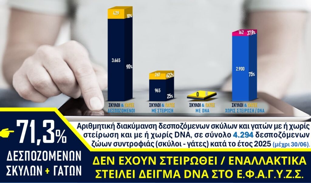 Ένα σημαντικό στοιχείο που προέκυψε από τα στοιχεία του ΕΜΖΣ είναι ότι το 71,3% των ιδιόκτητων ζώων στον Δήμο δεν είναι στειρωμένα ή δεν έχει ληφθεί DNA. Αυτό το υψηλό ποσοστό αποτελεί πηγή κινδύνου για τη δημιουργία νέων αδέσποτων, υπογραμμίζοντας την ανάγκη: