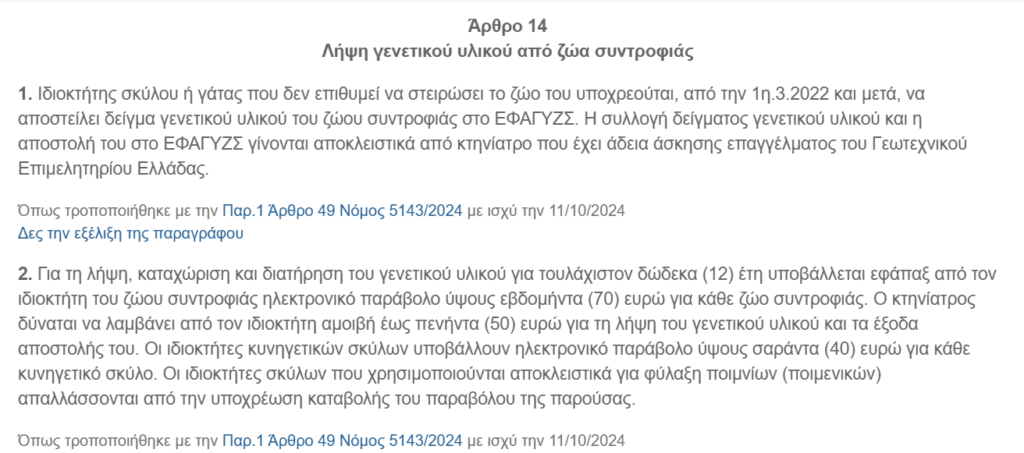 1. Στο άρθρο 14 του ν. 4830/2021 (Α`169), περί αποστολής, λήψης, καταχώρισης και διατήρησης του γενετικού υλικού των ζώων συντροφιάς, επέρχονται οι ακόλουθες τροποποιήσεις: α) στο δεύτερο εδάφιο της παρ. 1, αα) το αρκτικόλεξο «ΕΕΓΥΖΣ» διορθώνεται στο ορθό «ΕΦΑ-ΓΥΖΣ», αβ) διαγράφονται οι λέξεις «, μέλος του Πανελλήνιου Κτηνιατρικού Συλλόγου,», β) στην παρ. 2, βα) στο πρώτο εδάφιο, οι λέξεις «ύψους εκατόν τριάντα πέντε (135) ευρώ» αντικαθίστανται από τις λέξεις «ύψους εβδομήντα (70) ευρώ», ββ) το δεύτερο εδάφιο αντικαθίσταται, βγ) προστίθεται νέο, τρίτο, εδάφιο και οι παρ. 1 και 2 του άρθρου 14 διαμορφώνονται ως εξής: