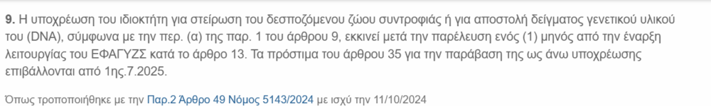 2. Στο δεύτερο εδάφιο της παρ. 9 του άρθρου 46 του ν. 4830/2021, περί χρόνου εκκίνησης της υποχρέωσης για στείρωση ή αποστολή δείγματος γενετικού υλικού δεσποζόμενου ζώου συντροφιάς, οι λέξεις «μετά την παρέλευση έξι (6) μηνών από την έναρξη λειτουργίας του ΕΦΑΓΥΖΣ» αντικαθίστανται από τις λέξεις «από 1ης.7.2025» και η παρ. 9 διαμορφώνεται ως εξής: